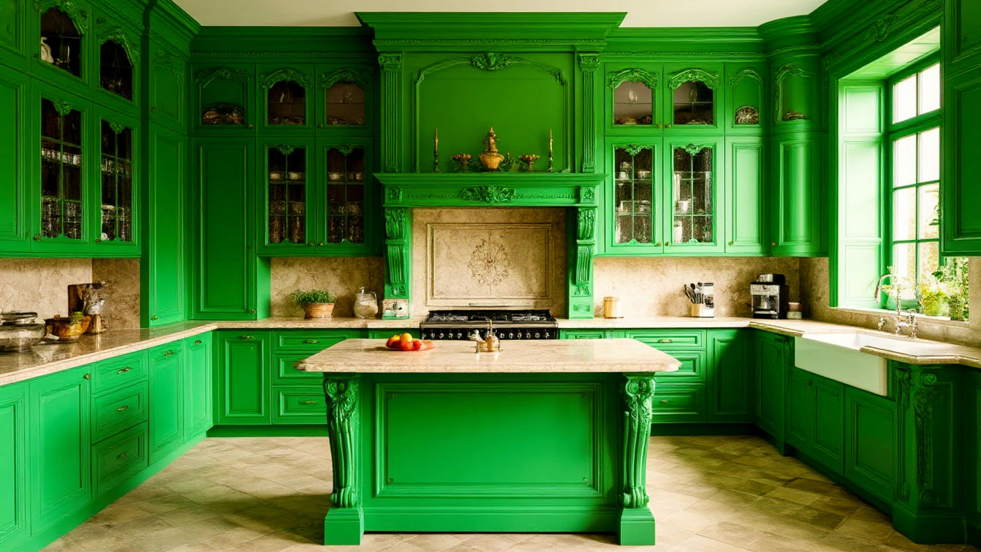 Системы хранения кухни "Гиацинт" продуманы до мелочей. Выдвижные ящики с плавным закрытием, шкафчики с регулируемыми полками и функциональные буфеты позволяют организовать пространство максимально эффективно. Каждый элемент встроен так, чтобы сохранять визуальную гармонию, при этом обеспечивая легкий доступ к необходимым предметам. Зеленый фасад кухни придает интерьеру свежесть, создавая ощущение гармонии и природной гармонии даже в роскошном барочном интерьере.