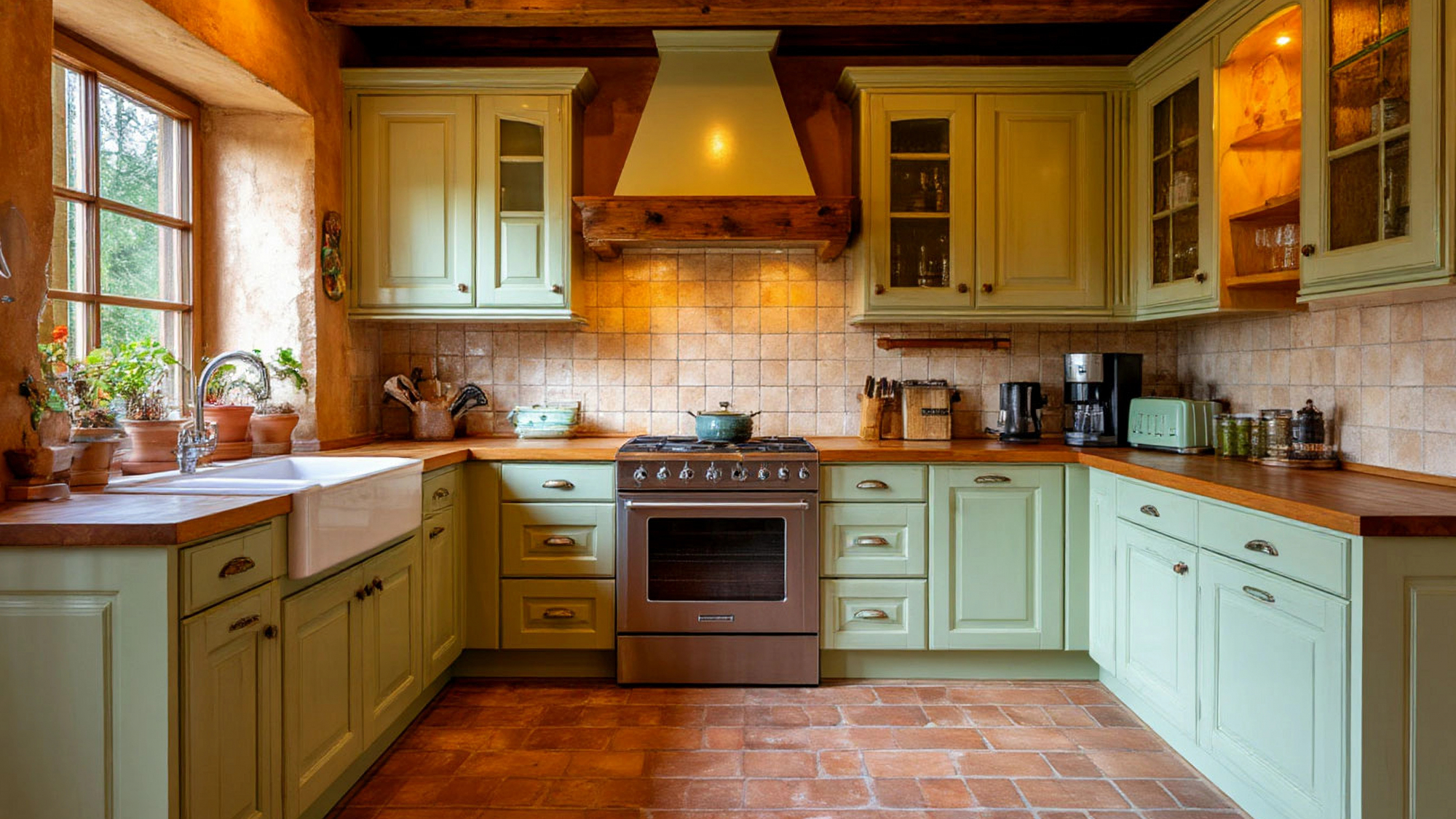 Цветовое решение кухни играет ключевую роль в восприятии интерьера. Тёплые, насыщенные оттенки зелёной эмали создают ощущение спокойствия и гармонии, прекрасно сочетаясь с натуральными текстурами дерева в столешницах, декоративными элементами и металлической фурнитурой. Такой контраст делает интерьер живым, интересным и выразительным, одновременно сохраняя его воздушность и лёгкость. Гармония оттенков позволяет создавать пространство, которое приятно воспринимать как визуально, так и эмоционально.